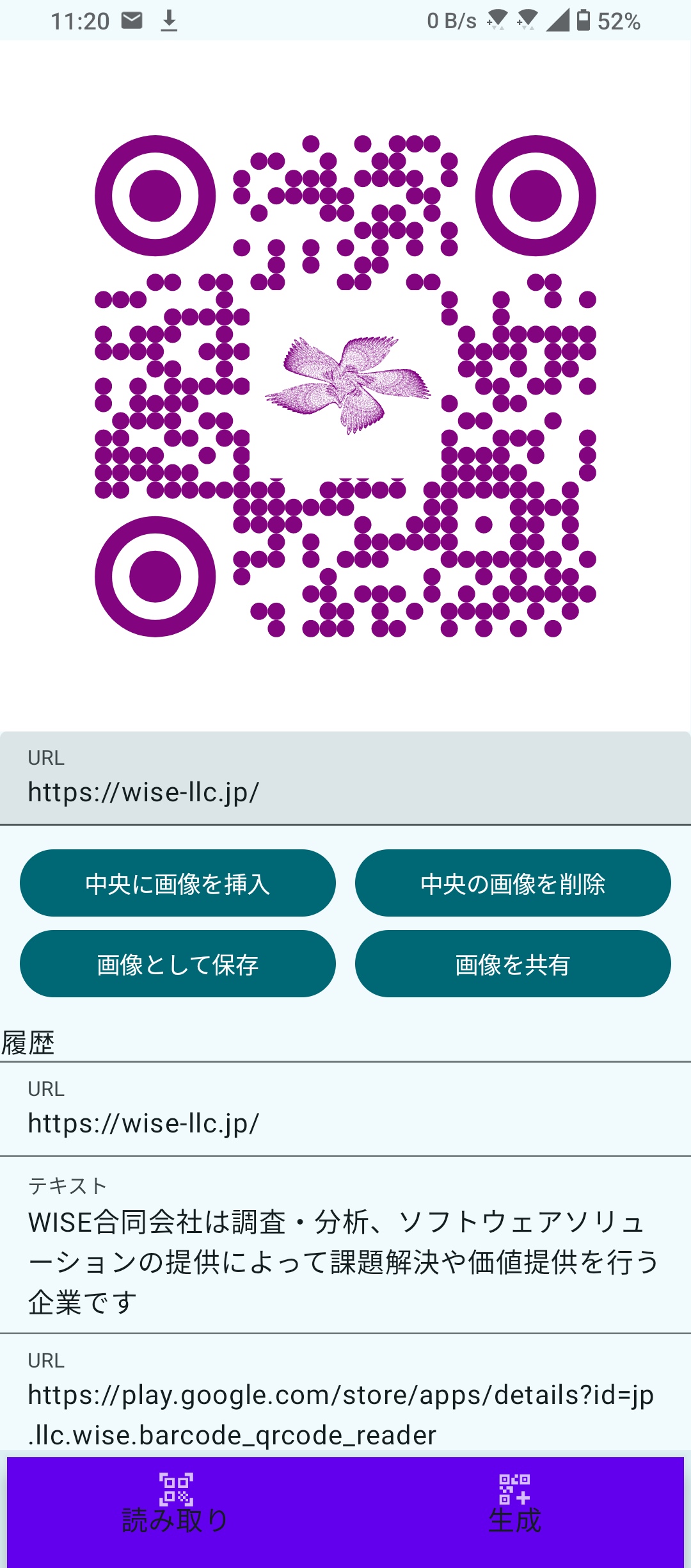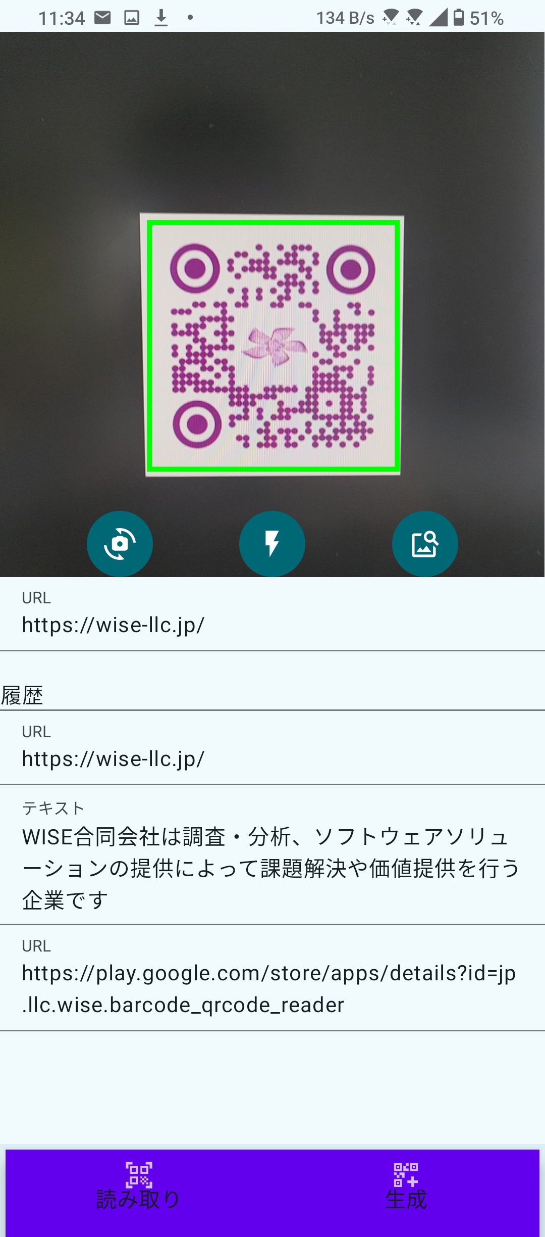 QRコードの読み取り、生成が可能なアプリです。それぞれ履歴を参照しながら利用可能です。