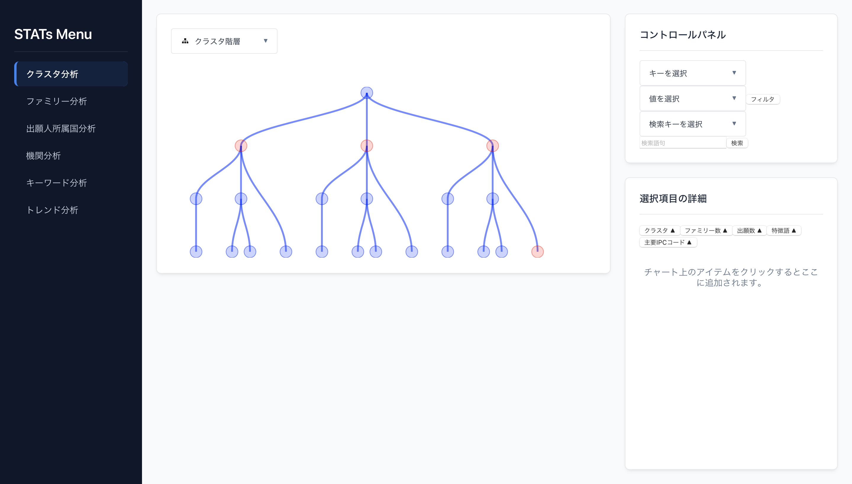 特許などの特殊なテキストと引用関係などを持つ半構造データを分析するツールです。収集したデータを整形しデータベース化した後、機械学習や数理モデルを用いて分析のためのデータに変換。クラスタ分析や機関分析、キーワード分析などが可能です。